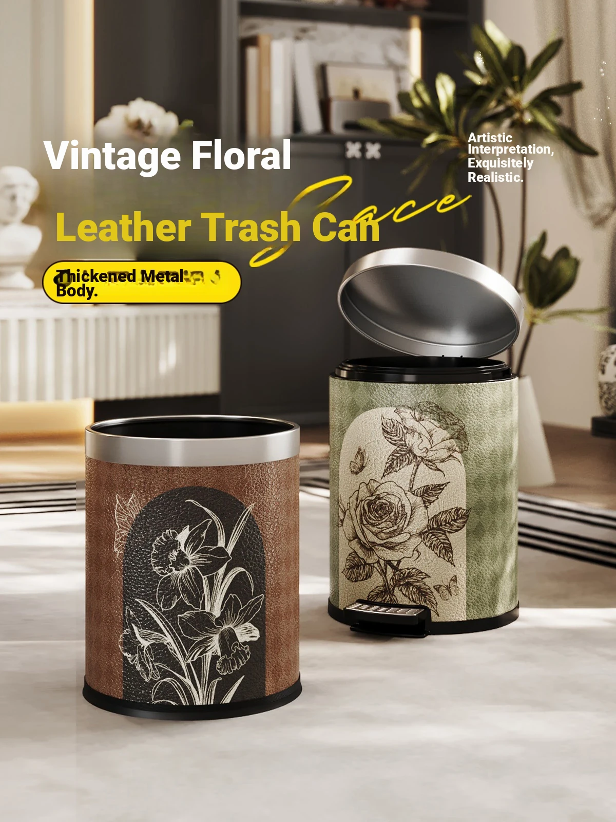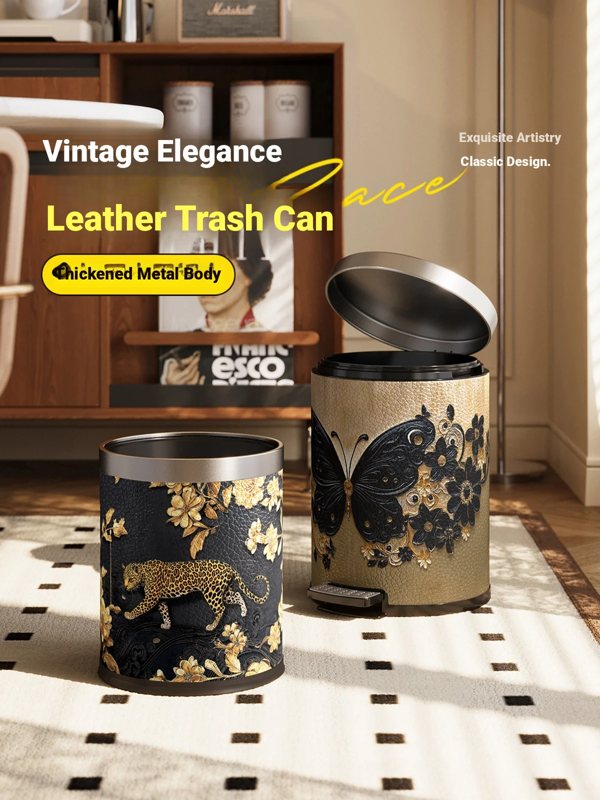Stylish High-End Retro Stainless Steel Leather Trash Can with Lid and Foot Pedal - Perfect for Luxury Living Rooms with a Vintage Touch