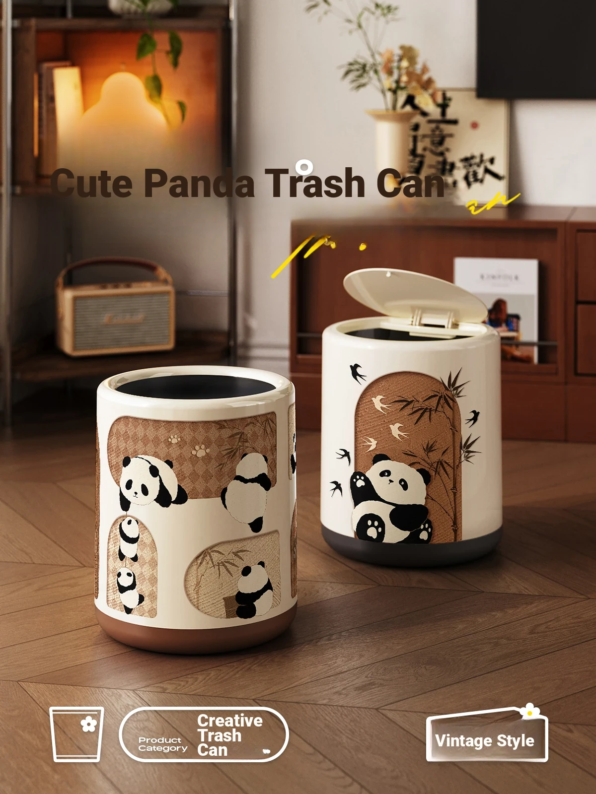Stylish Retro Panda Trash Can with Lid - Large Press-Type Waste Bin for Home Use, Perfect for Living Room and Bedroom Decor