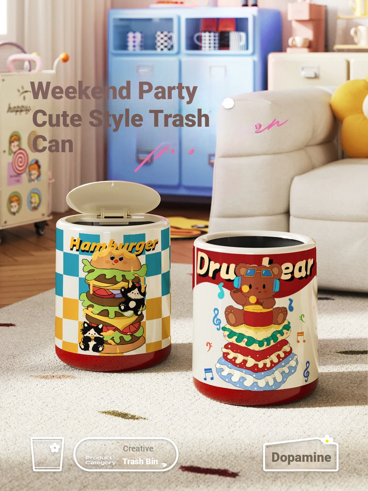 Stylish Cartoon Dopamine Cream Trash Can - Large, Lidded Waste Bin for Home, Perfect for Living Room & Bedroom Decor!